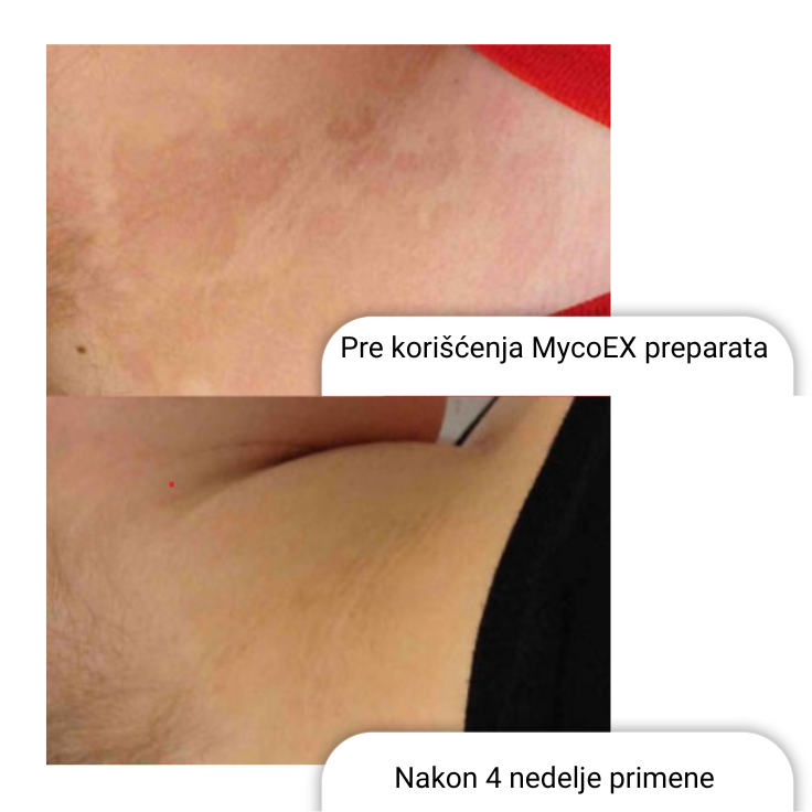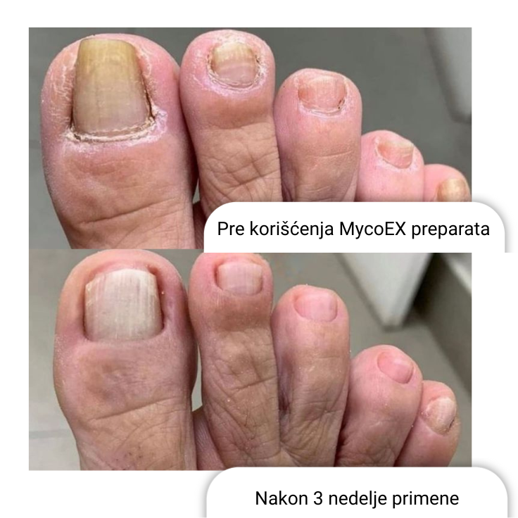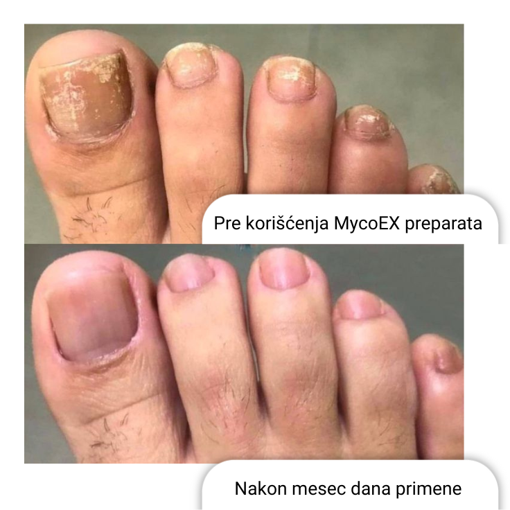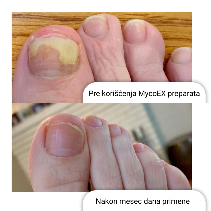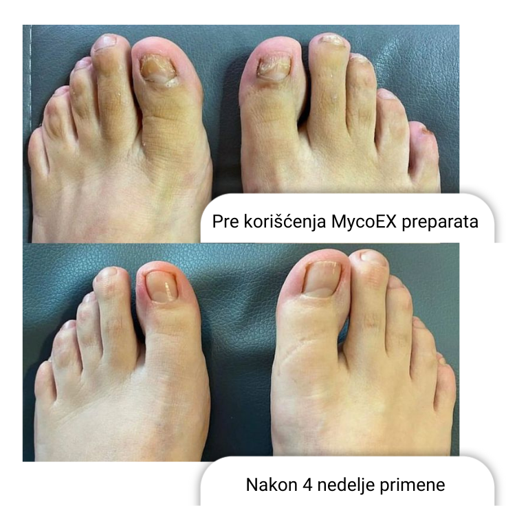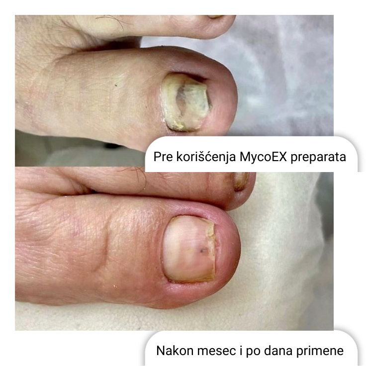 Posle duge i bezuspešne borbe sa farmaceutskim kremama htela sam da odustanem ali kada sam čula kakve sve posledice mogu da se jave ako se ovaj problem ne tretira nastavila sam istraživanje. Pronašla sam MycoEx i jako sam Vam zahvalna! Ovo su moji rezultati a nisam verovala da nešto na biljnoj bazi ovako temeljno rešava problem. Cena je malo jača ali kao što vidite vredi.